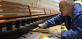 Feinjustierung an der CNC-Tafelschere vor dem Scherschneiden