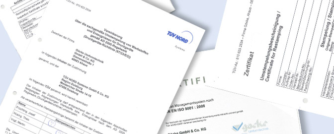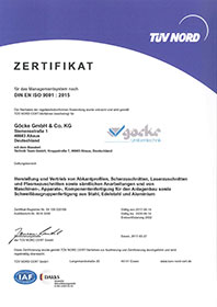 Die TÜV CERT-Zertifizierungsstelle der RW-TÜV Anlagentechnik GmbH bescheinigt gemäß TÜV CERT-Verfahren, dass das Unternehmen Göcke GmbH & Co KG in Ahaus für den Geltungsbereich ein Qualitätsmanagement eingeführt hat.
